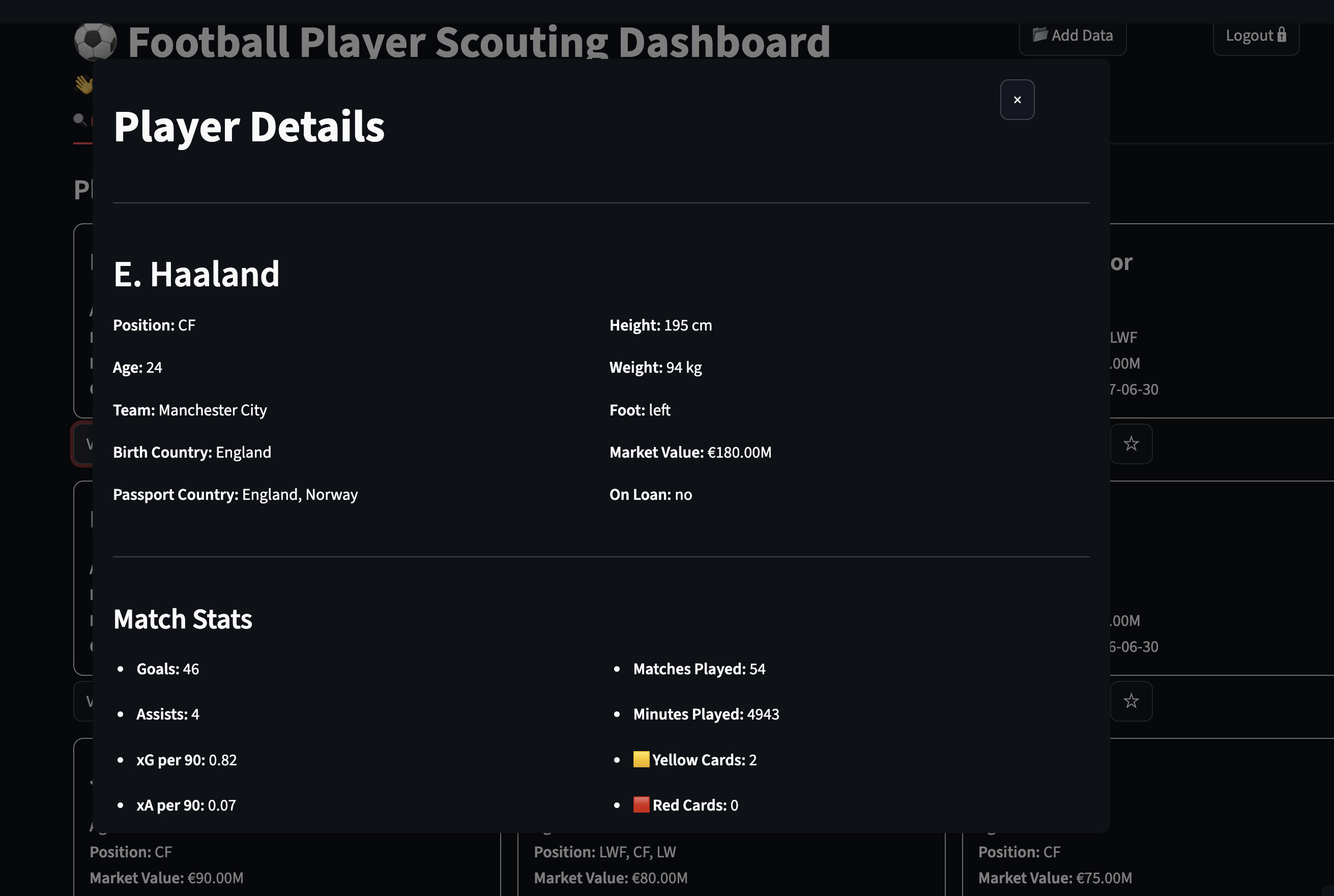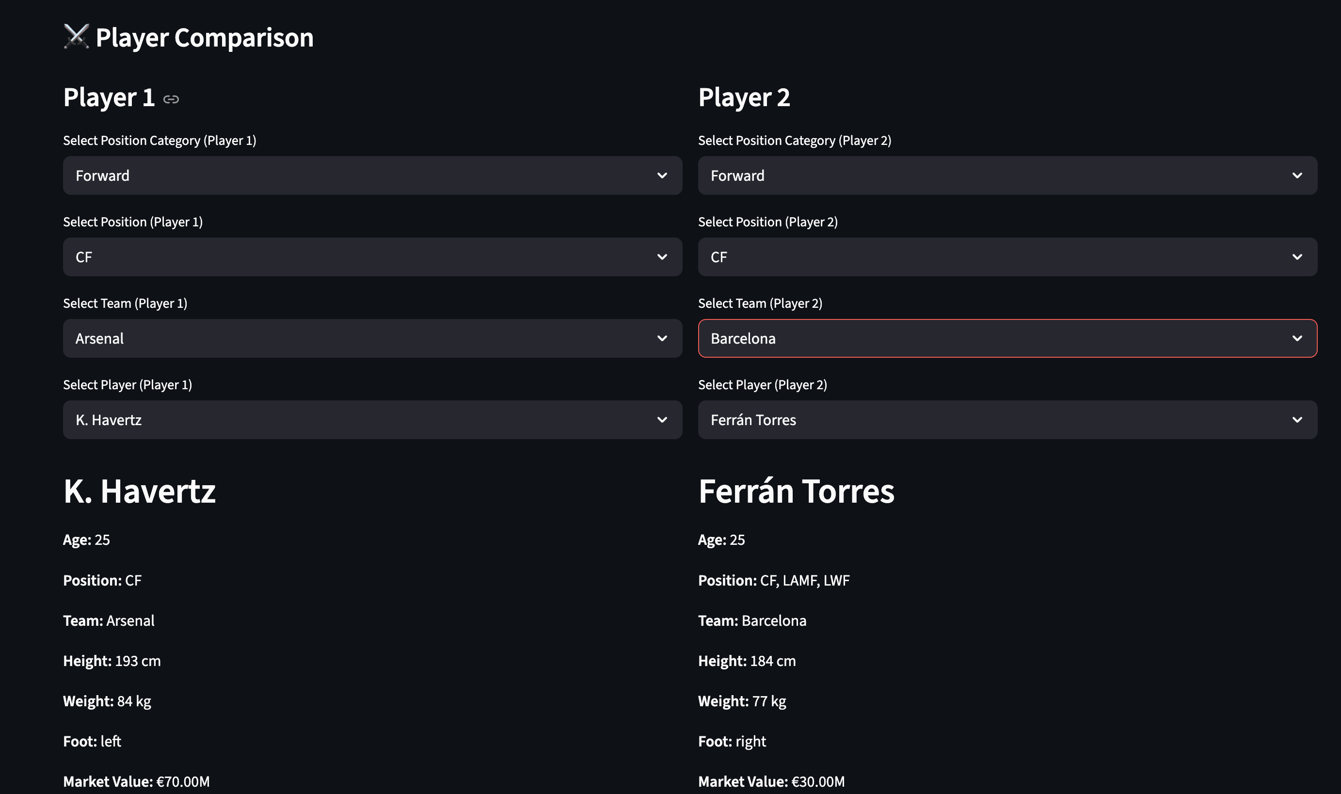 Player Scouting Dashboard is an interactive data analytics dashboard built for modern football recruitment. The platform enables scouts and analysts to upload custom datasets, filter players across multiple dimensions including position, age, market value, and performance metrics, and conduct in-depth comparative analysis. Features include dynamic radar chart visualizations powered by Plotly, a comprehensive player browser with detailed modal views, side-by-side player comparison tools, and a personalized favorites system. Built with Streamlit and Python, the platform supports flexible data ingestion via CSV/Excel uploads or Google Drive integration, making it a versatile tool for data-driven player evaluation and scouting workflows.